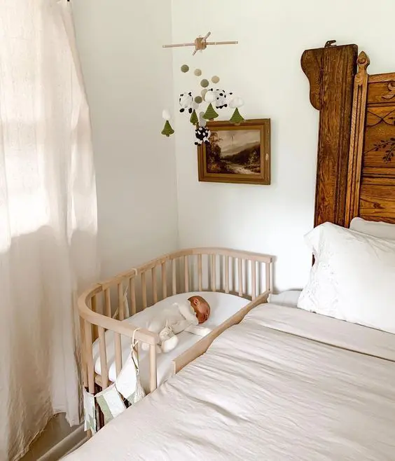 If you love a touch of nostalgia, a wooden crib with a curved frame brings a vintage charm to your bedroom. Paired with a simple mobile or framed artwork, it becomes a cozy little nook for baby right beside you.