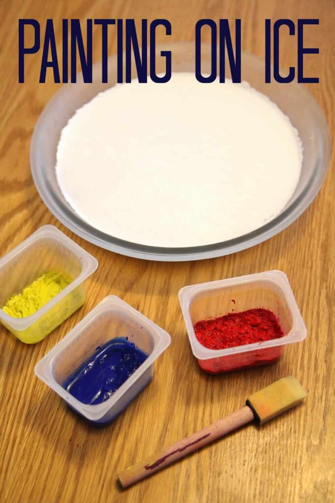 Start by freezing a tray of water mixed with a little baking soda. The baking soda turns the ice a bright white, making the paint colors pop. Once frozen, take the ice out and let your kids paint right on top using brushes and washable paints.