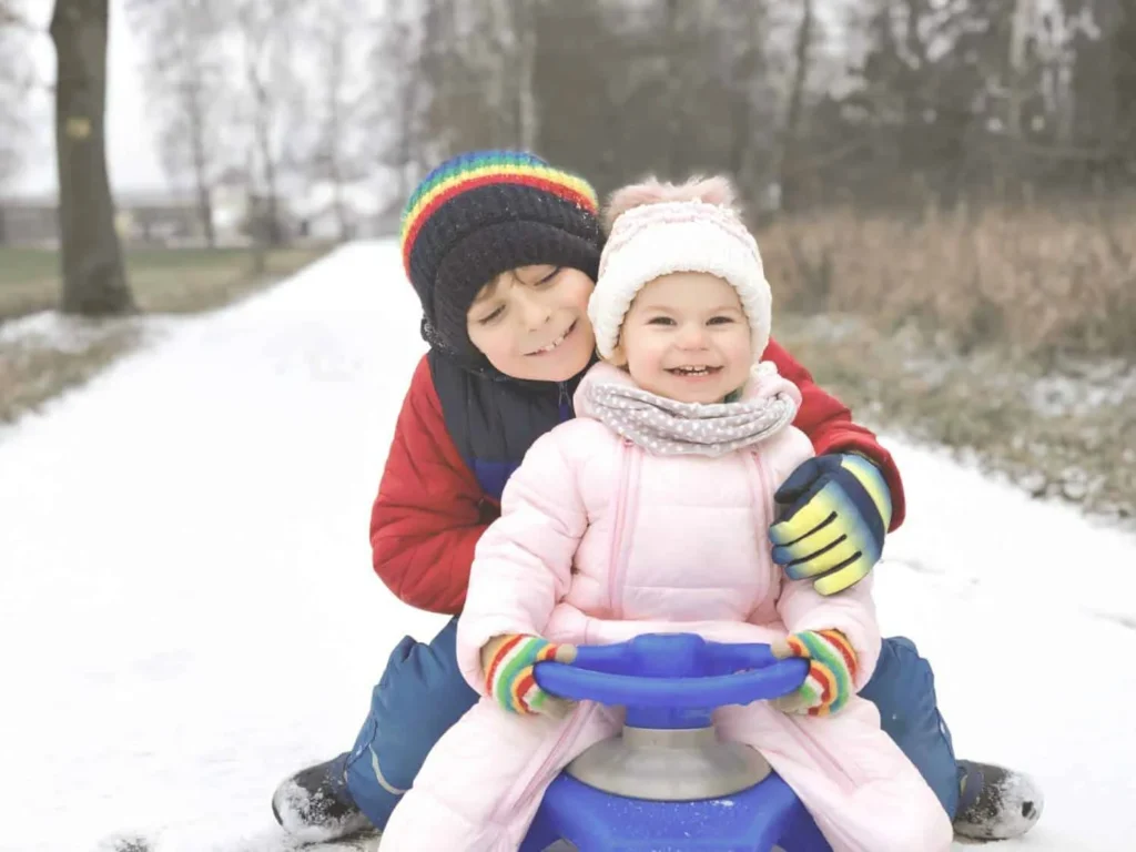 If your toddler isn’t ready for big hills yet, grab a toddler-sized sled and take a slow ride around the yard or down a gentle slope. Older siblings can join in too, with the youngest riding up front for a sweet shared adventure.