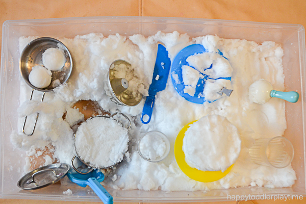 You can bring the snow inside during a snow day or take the kitchen toys outdoors for a frosty twist. Just fill a large sensory bin with packed snow and lay a blanket underneath to catch any spills. Hand your child some kitchen tools, cups, and bowls, then let the fun begin.