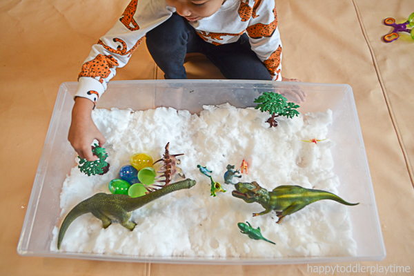 If your kids love dinosaurs, this snowy dino world will be a total hit. It’s a simple sensory activity that brings their favorite toys to life in a winter wonderland.