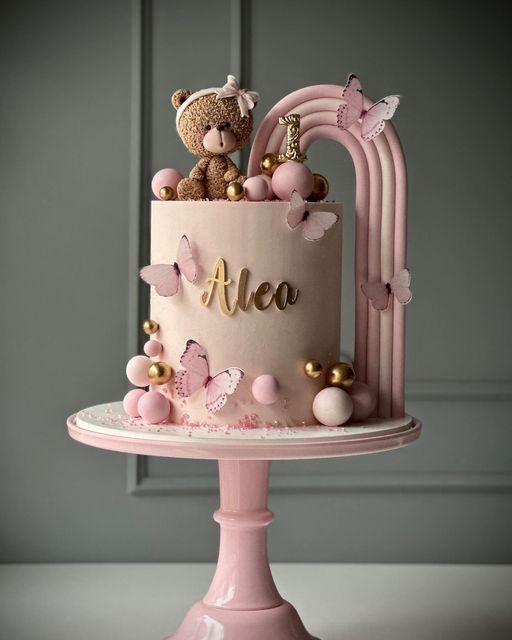 This cake feels soft and dreamy with its pastel pink tones and gentle butterfly details. The little bear topper adds a cute and cozy touch that feels just right for a first birthday. I love how the rainbow shape keeps the design playful without being loud. It is a beautiful choice if you want something elegant and sweet.