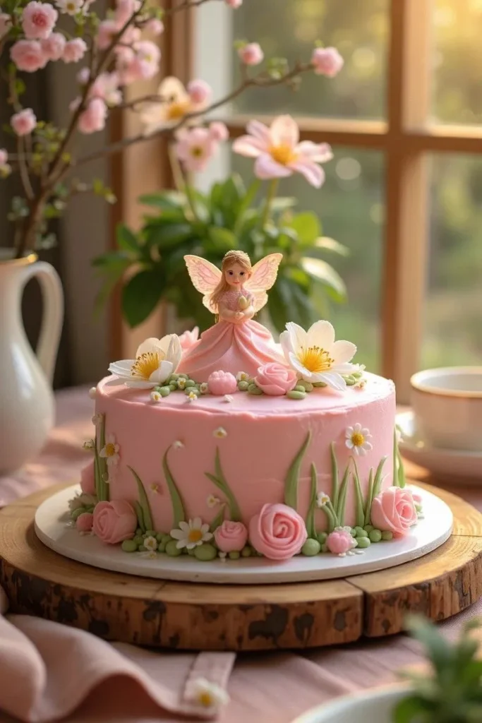This cake looks like a peaceful spring morning in a garden. The fairy topper and soft flowers give it a gentle and warm feel. I really like how the pink base keeps everything soft and welcoming. It is a lovely option if you want a magical but calm cake.