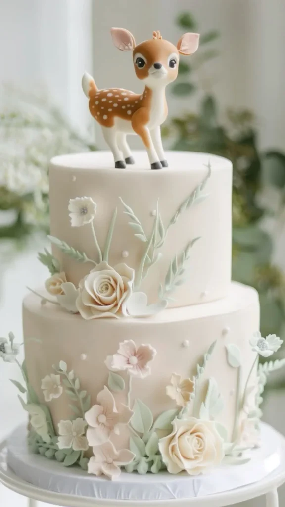 This cake feels clean, modern, and very soft. The little deer on top adds charm without making the cake look busy. I love the neutral shades mixed with gentle florals for a spring celebration. It works well if you prefer a simple and elegant style.