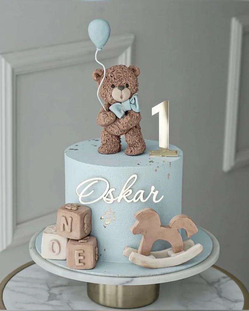 This cake feels timeless and sweet from every angle. The teddy bear topper and soft blue color create a calm and happy vibe. I like how the simple details keep the focus on the first birthday moment. It is a great choice if you want something cute and classic.