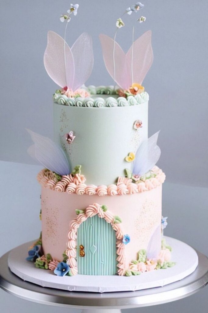 This cake feels like a tiny spring fairy home. The soft pastel colors and little door details make it look magical but still calm. I really like how this design feels playful without being too bright. It is a lovely option if you want something storybook-inspired.