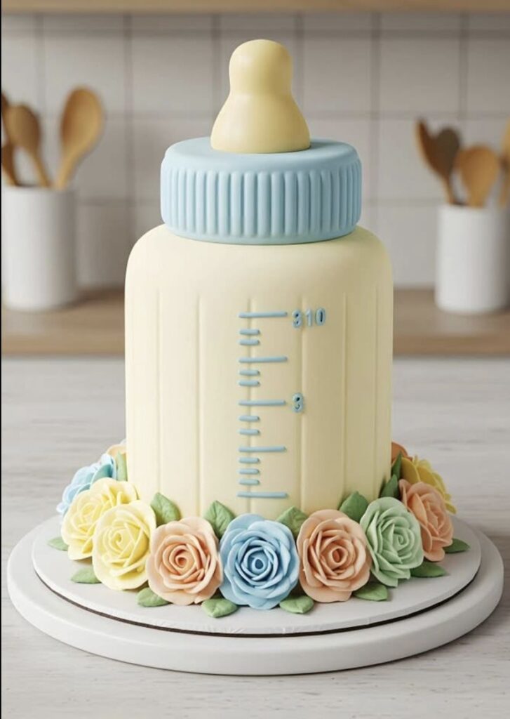 This cake is playful and sweet with a cute baby bottle design. The soft yellow and blue colors keep it light and cheerful. I have seen this style work well for simple family celebrations. It is a fun choice that still feels clean and neat.