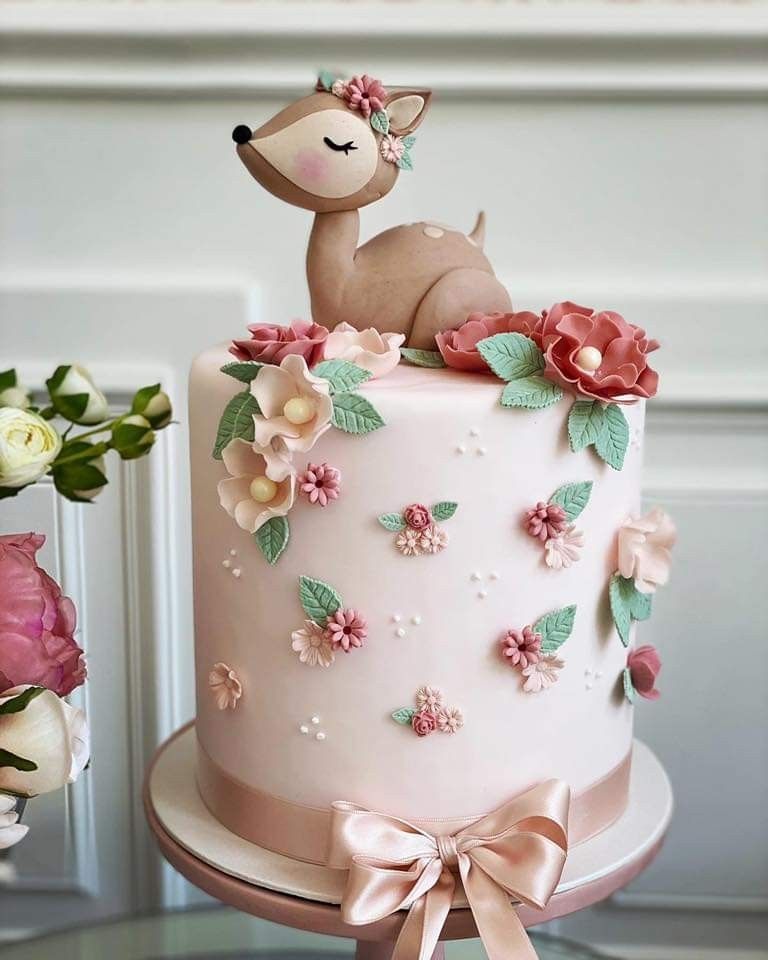 This design is simple but full of charm. The soft blush base with tiny flowers feels fresh and light for spring. I have seen cakes like this become a favorite in photos because they look clean and warm. The sleeping deer topper adds a peaceful and loving feel.