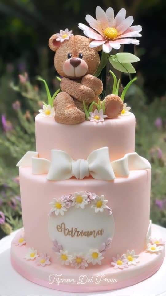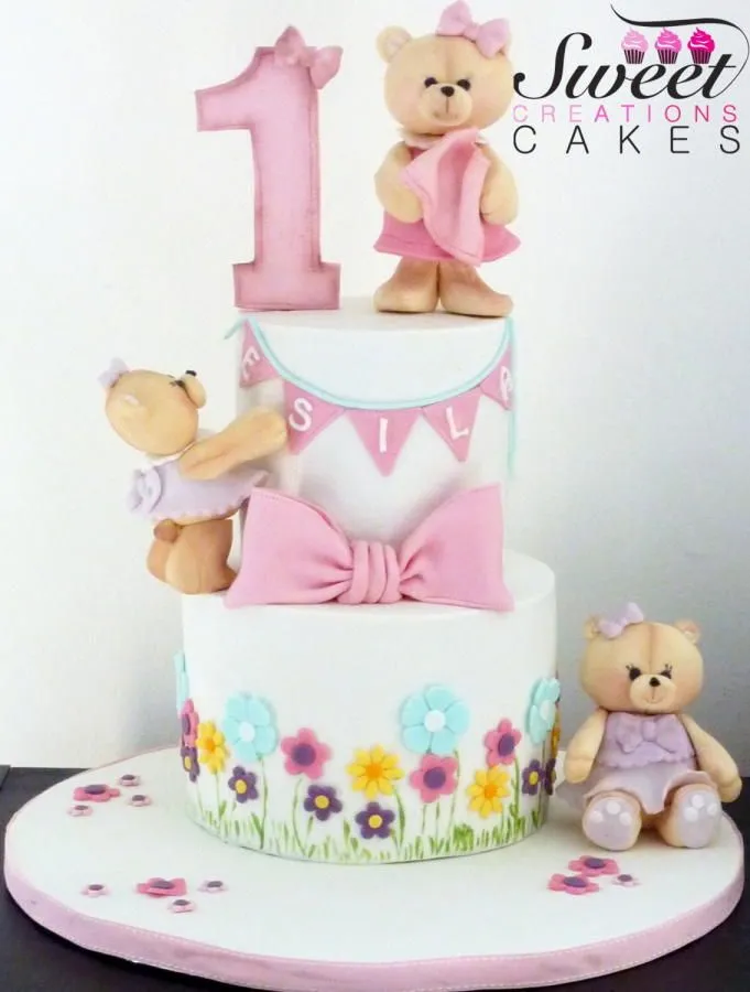 Floral Teddy First Birthday Cake