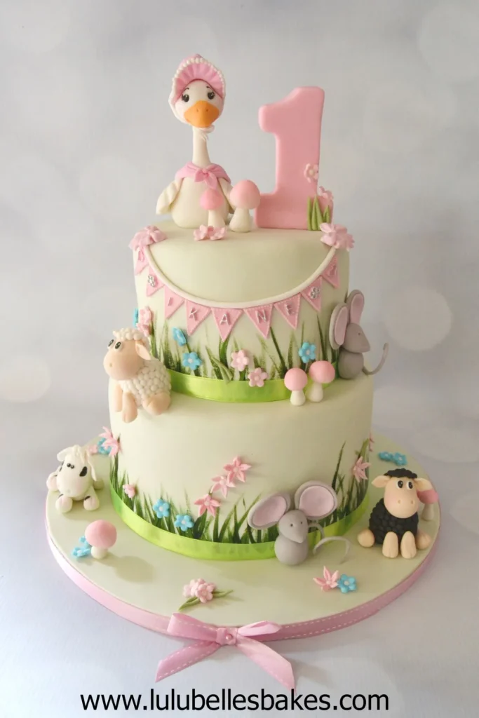 This cake feels cheerful and storybook-inspired. The soft green and pink colors work beautifully for a spring celebration. I love how the small animals add detail without making the cake look crowded. It is a great option if you want a happy and friendly theme for your baby’s big day.