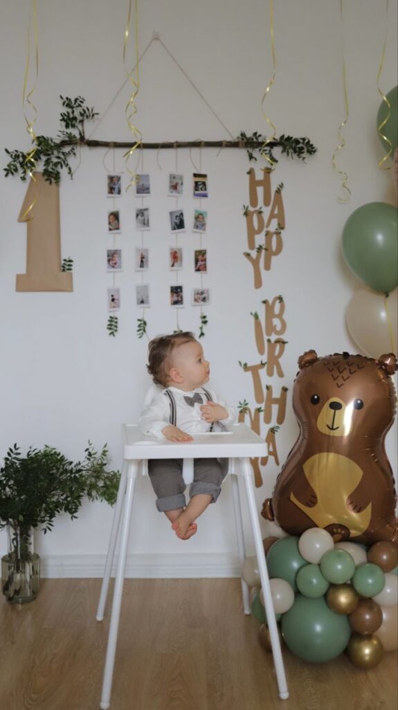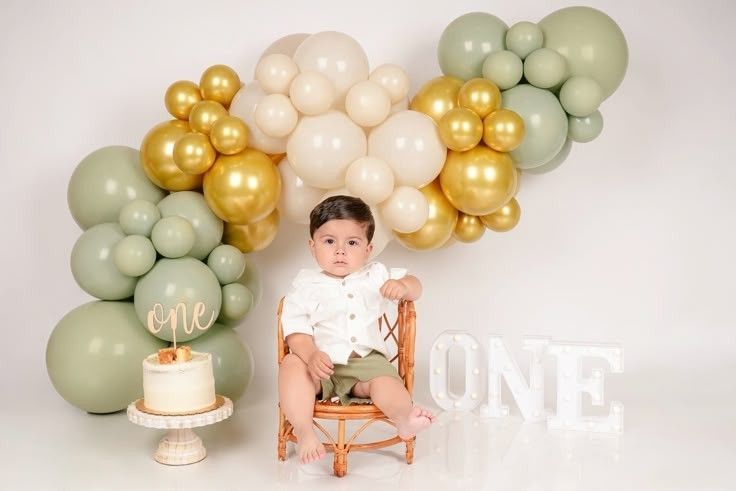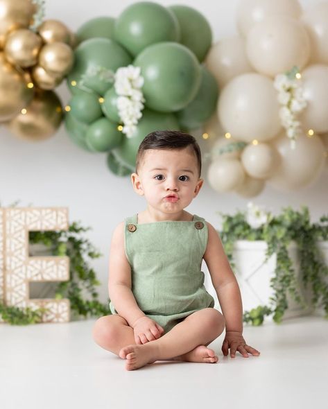 This outfit feels fresh and calm, which makes it perfect for a spring first birthday. The light green romper looks gentle on the skin and keeps the baby comfortable during the celebration. I like this style because it works well with soft balloon decor and natural light. It is easy to wear and great for photos.