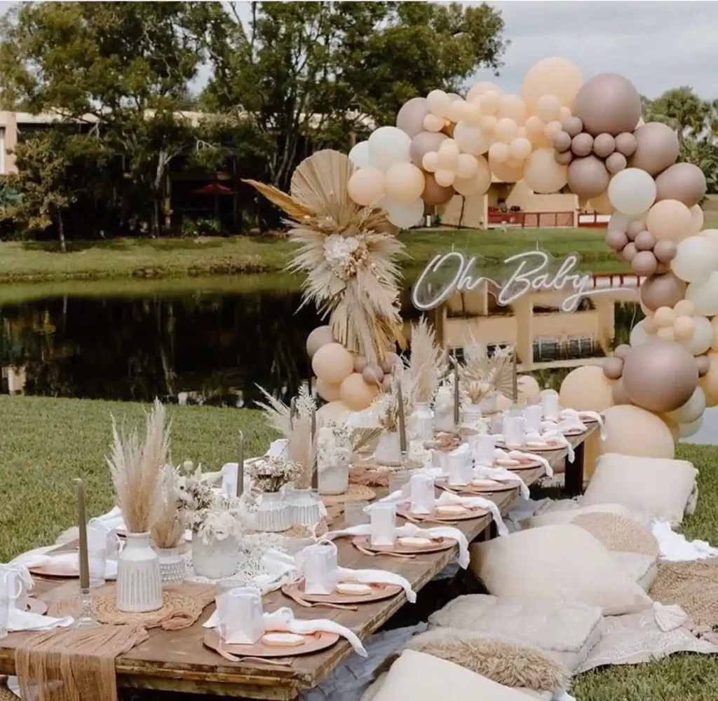 Create a gender reveal with an earthy, natural feel by using deep browns, creamy whites, and soft beige tones. Add linen textures and fresh flowers to tie it all together. This neutral color palette feels timeless and perfectly suited for spring’s calm and refreshing energy.