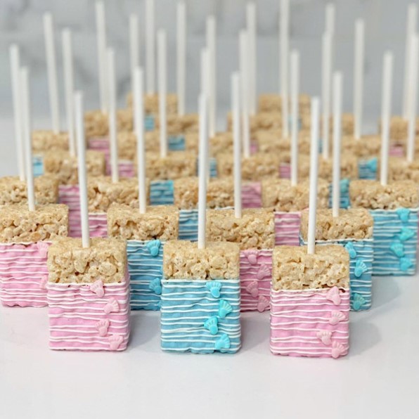These chocolate-covered crisped rice pops are the perfect mix of fun and nostalgic. Decorate them in pink and blue or add tiny baby footprints for an extra-cute detail. They’re gluten-free, easy to grab, and look so good on a dessert table.