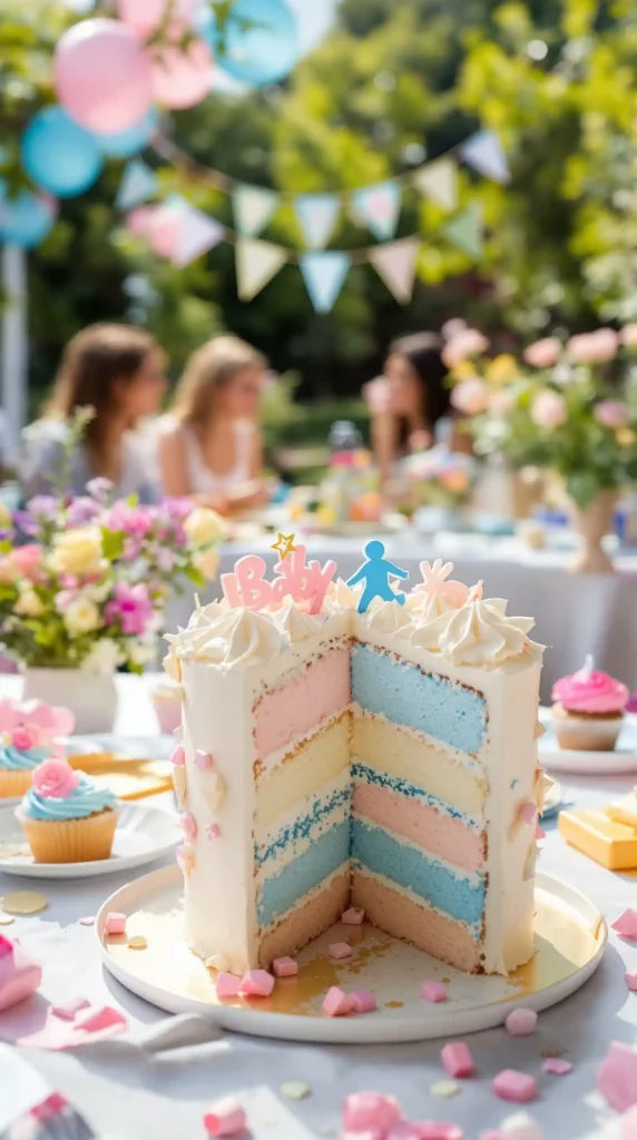 Spring days are made for garden parties, and they’re even more special when they double as a gender reveal. Picture a sunny afternoon surrounded by flowers, pastel decorations, and the centerpiece, a layered cake hiding pink or blue inside.
