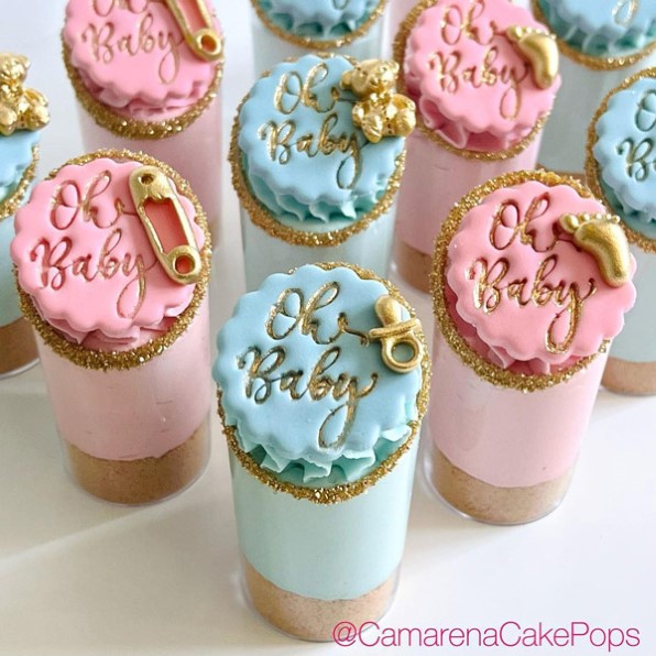 Serve up something sweet and elegant with mini cheesecake cups. These adorable desserts can be tinted pink or blue and topped with gold pacifiers, teddy bears, or tiny footprints for a charming touch. They’re the perfect bite-sized treat that feels both fancy and fun.