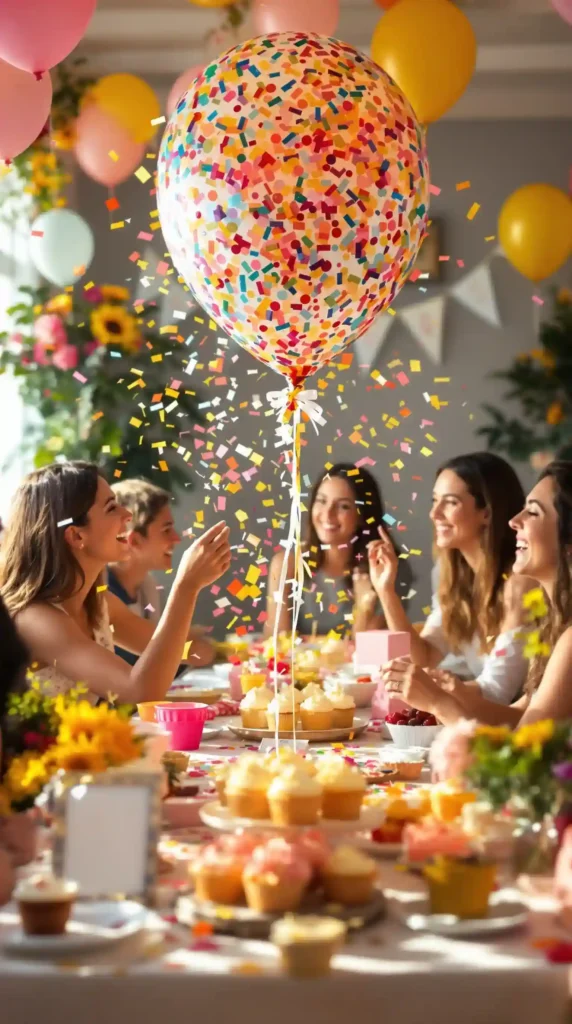 This playful setup pairs perfectly with a spring-themed table filled with treats, fresh fruit, and light bites. The best part? It’s simple to set up. Just fill a clear balloon with your chosen confetti colors, tie it up, and get ready for the big pop.