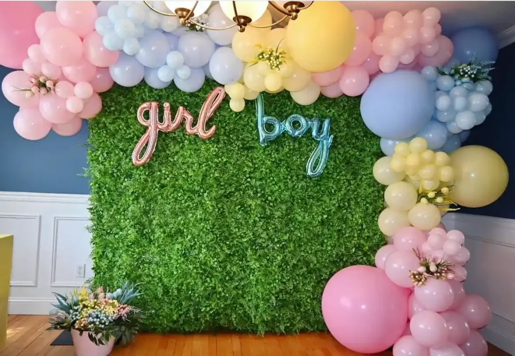 Looking for a backdrop that feels cheerful and picture-perfect? Create a setup using a piece of MDF wood covered with faux grass. Add a balloon arch in soft pastel shades to bring that spring vibe to life, and finish it off with a “girl” and “boy” balloon for the big reveal moment.