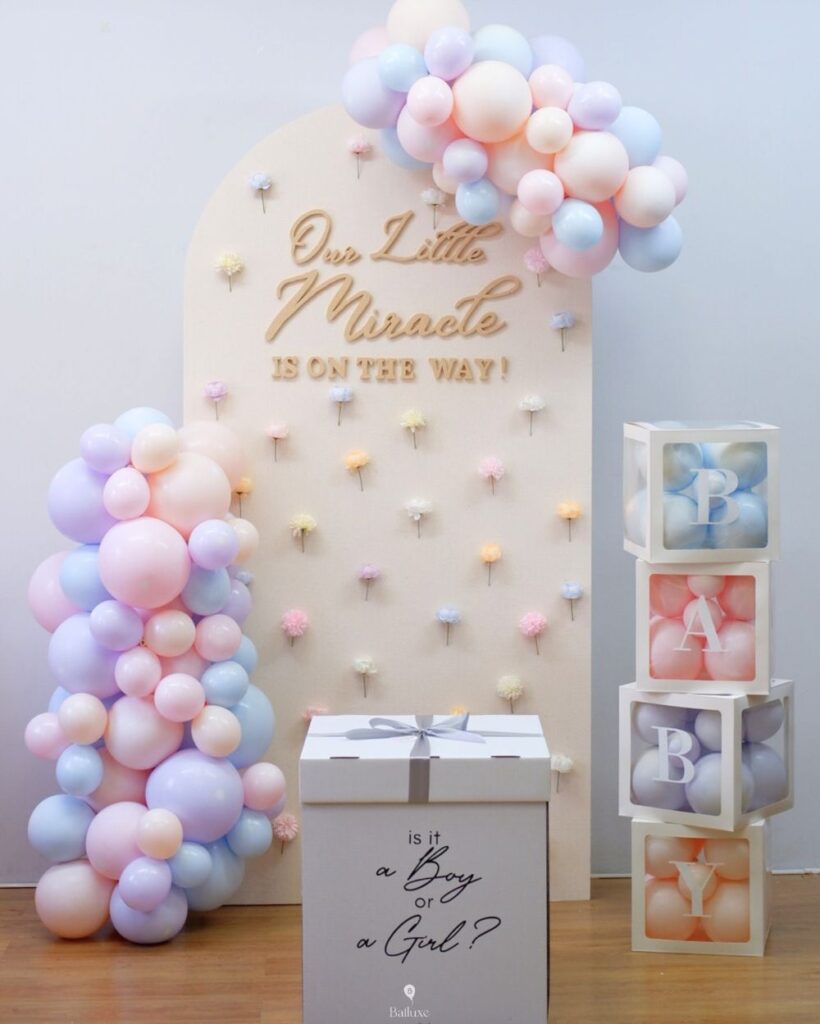 A balloon box reveal never goes out of style. Fill a box with colored balloons that float out once opened, creating a fun and cheerful reveal moment. Use soft pastel shades and add floral decorations for a fresh spring look that feels bright, joyful, and timeless.