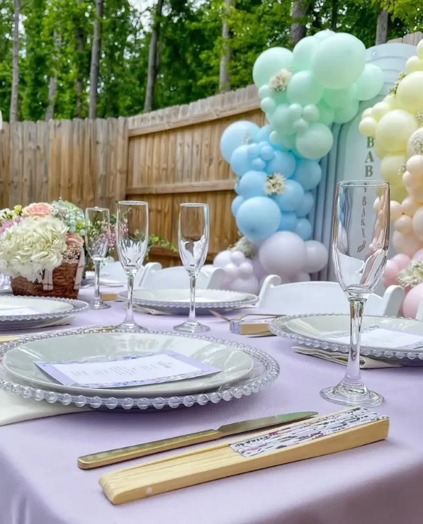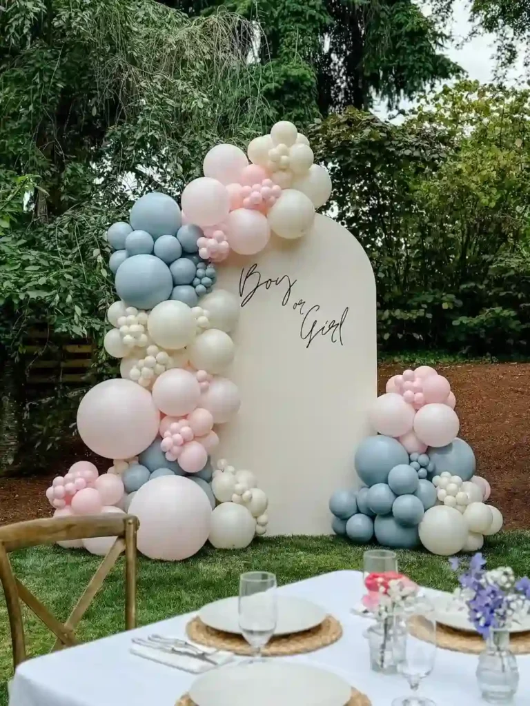 A garden party is a classic spring favorite and a perfect setting for your gender reveal. Use a rainbow palette for a cheerful look or go with soft blues and pinks for a more traditional touch. Surrounded by flowers and natural light, this setup feels relaxed, inviting, and full of joy.