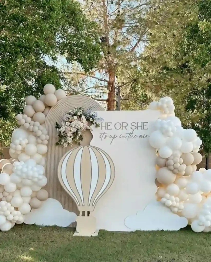 The “It’s Up in the Air” theme is a dreamy choice for a spring gender reveal. Think clouds, pastel balloons, and airy decor that makes everything feel light and whimsical. This theme works beautifully with a neutral palette or soft pink and blue tones to keep it classic yet elegant.
