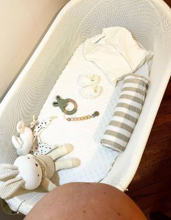 Nothing says “baby on board” like a cozy setup featuring your bump, some tiny swaddles, baby booties, and a plush toy or two. Add in your SNOO for an extra sweet touch and let the picture tell your story.