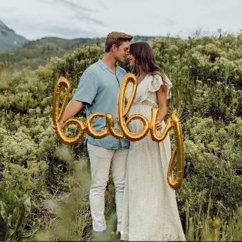 Picture this: you, your partner, a peaceful field, and a baby-shaped balloon floating gently in the breeze. The soft light and open sky create a dreamy moment that perfectly celebrates your growing family.