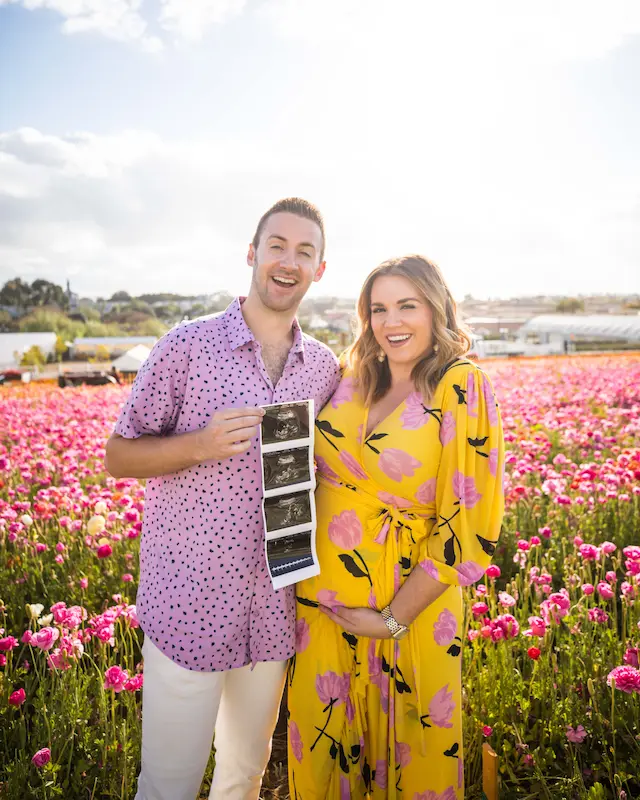 Nothing says spring like a field bursting with color and sunshine. This beautiful pregnancy announcement captures pure happiness as the parents-to-be share their big news surrounded by bright blooms.