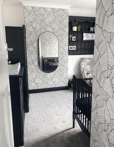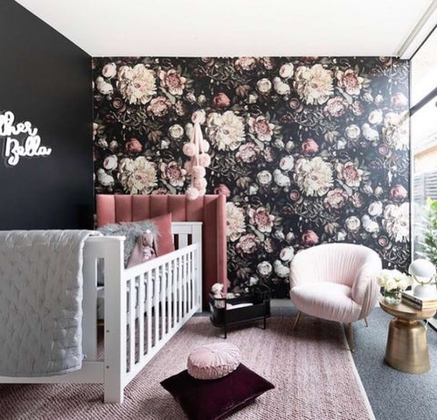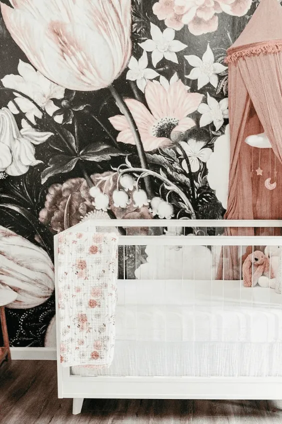 For a feminine twist, bring in floral accents. Bursts of flowers against black walls feel both soft and dramatic, making the space perfect for a baby girl.