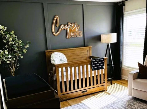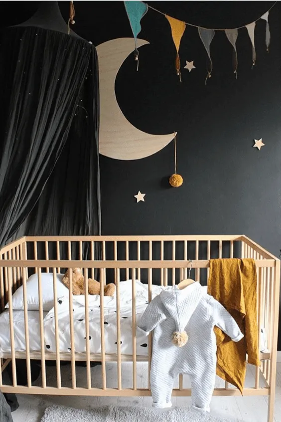 Dark neutrals like hardwood floors and honey-toned cribs soften an all-black room. These lighter touches keep the nursery warm and balanced while still maintaining that cool, moody look.