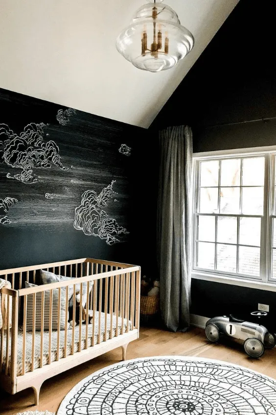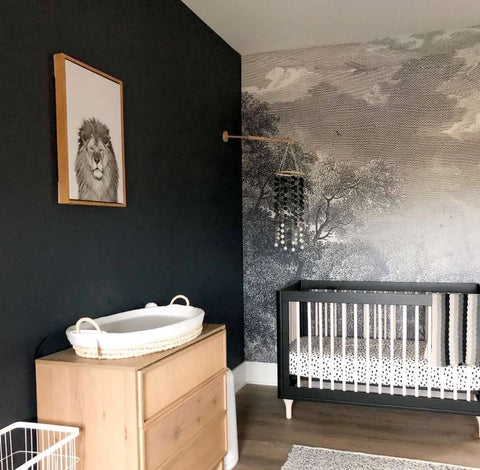 You do not need to paint all four walls. A couple of black walls paired with a mural can be just as stunning. A sleek black crib makes the mural stand out beautifully.