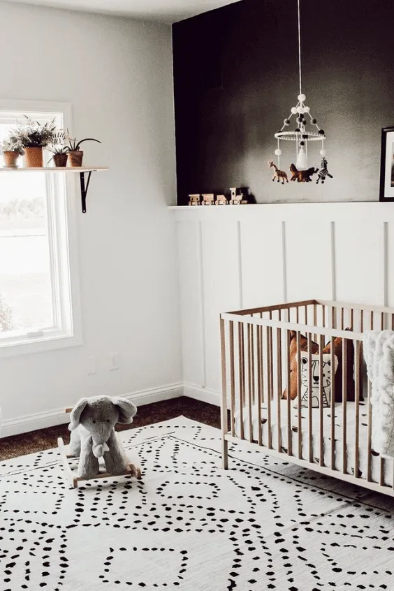 A bold, high-contrast rug instantly livens up the nursery. The mix of black and white makes the room feel playful and contemporary, while tying the design together.
