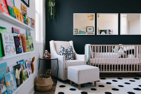 Bright pops of color can keep a black nursery feeling joyful. Try rainbow books, a colorful blanket draped over a chair, or a patterned rug to break up the darkness while keeping things baby-friendly.