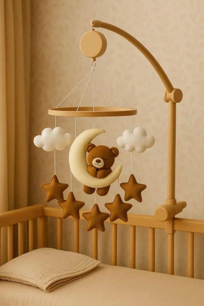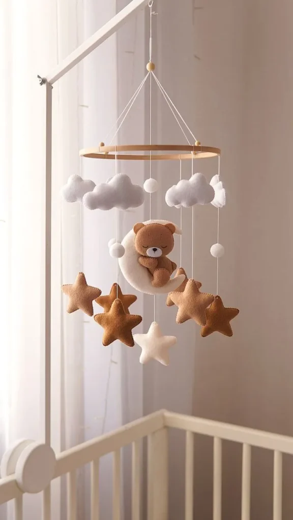 A hanging mobile with teddy bears, clouds, and little stars creates a dreamy scene above the crib. The soft felt textures make it safe and gentle while adding movement to the nursery.