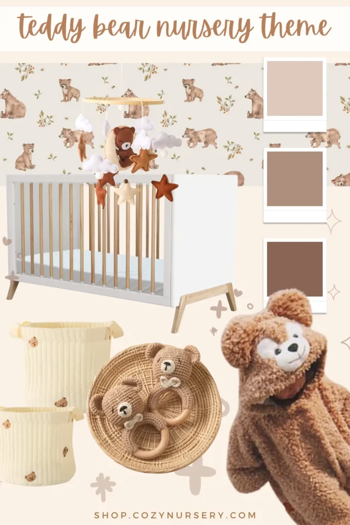This board shows how different teddy bear decor items come together in one theme. From wallpaper with bear prints to mobiles, baskets, and cozy outfits, the room feels complete and well-planned. The mix of beige and brown tones keeps everything soft and modern. It’s a great guide for parents looking for a full teddy bear look.