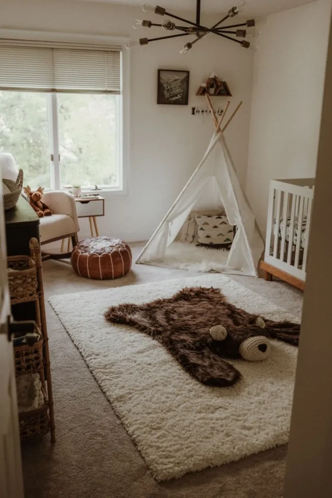 This nursery uses a playful bear rug in the middle of the room, which instantly adds character. The soft white carpet underneath makes the dark brown rug stand out beautifully. A small teepee tent in the corner creates a cozy spot for reading or playing. The whole space feels adventurous yet warm at the same time.