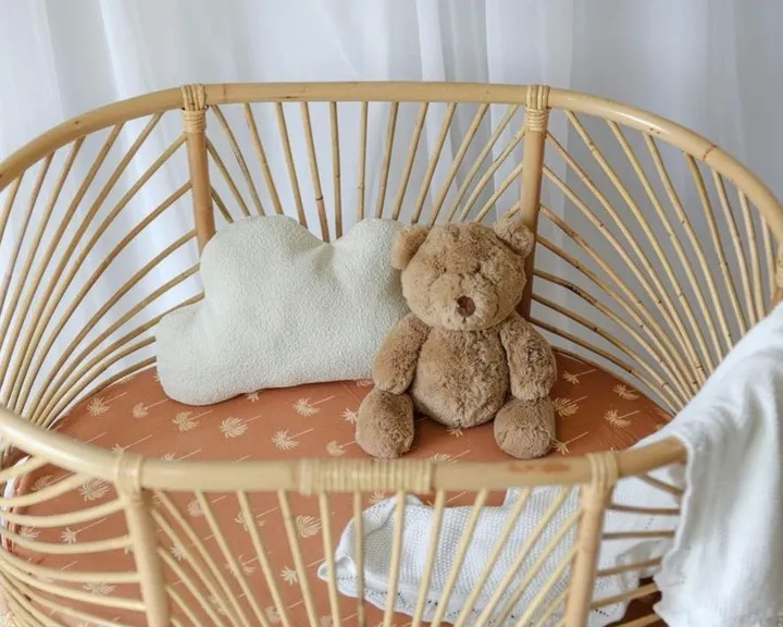 A simple rattan crib decorated with a teddy bear and a cloud-shaped pillow feels soft and calming. The natural wood tones pair well with the warm bedding. This little detail shows how just two accessories can bring the teddy bear theme to life. It’s minimal, cozy, and perfect for a small nursery space.