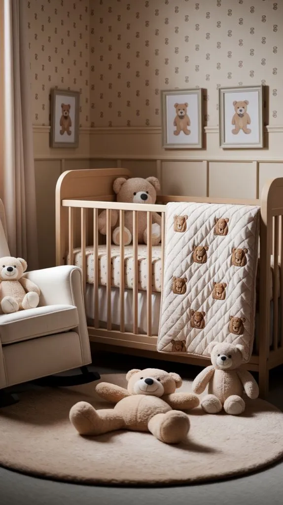 Here the whole nursery is built around teddy bears, from the crib bedding to the wall art. Plush bears sit neatly in the crib and on the chair, adding comfort and charm.