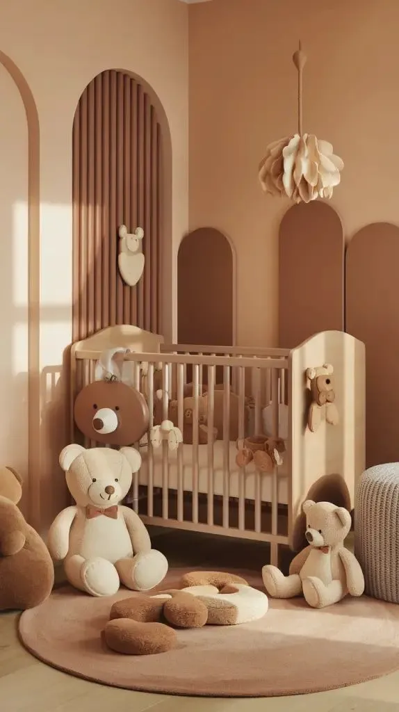 This nursery uses soft beige and brown tones to highlight teddy bears in every corner. Large plush bears sit by the crib while smaller ones are placed as accents.