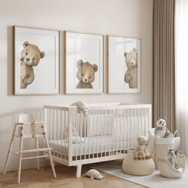 These framed prints show teddy bears in stylish black and white outfits, giving the nursery a modern touch. The bold lines make the artwork stand out without being too busy. They are perfect for parents who want a teddy bear theme but with a more grown-up look. Wall art like this keeps the space playful while staying chic.