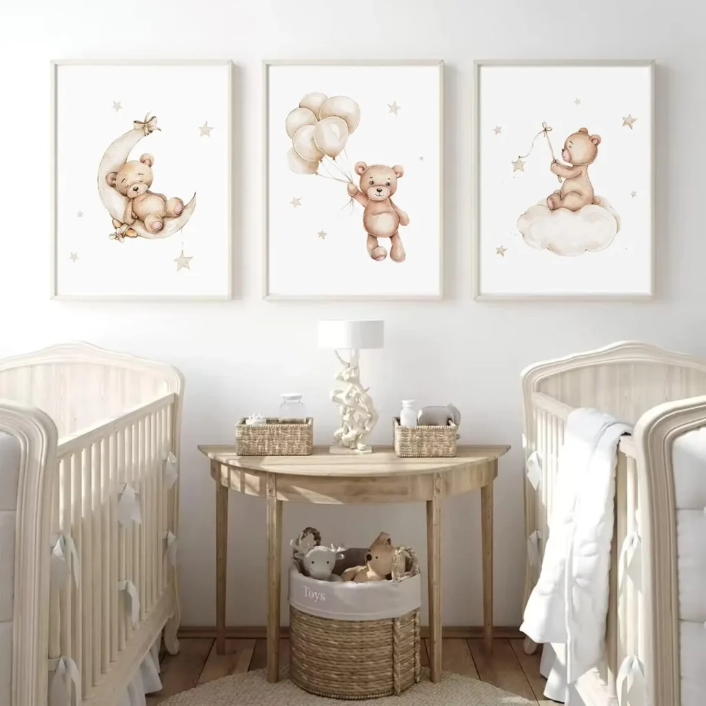 This set of framed prints adds a soft and charming touch to the nursery. Each picture shows a teddy bear with balloons, stars, or clouds, bringing a playful story to the walls.