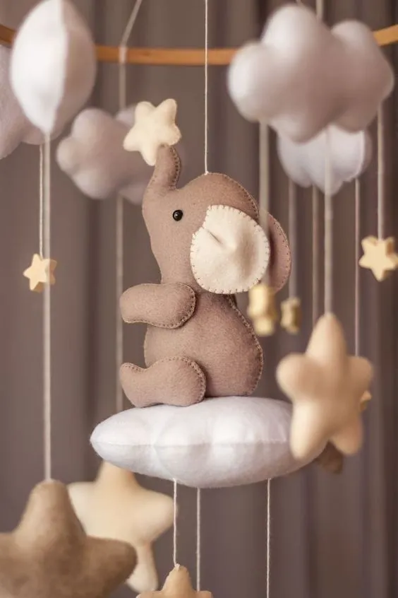 This close-up shows a felt elephant sitting on a fluffy cloud surrounded by tiny stars and clouds. The neutral beige and white colors keep the design soothing while still playful. It’s the kind of mobile that becomes a favorite nursery detail because of its soft, handmade charm. Small touches like this make the space feel personal.