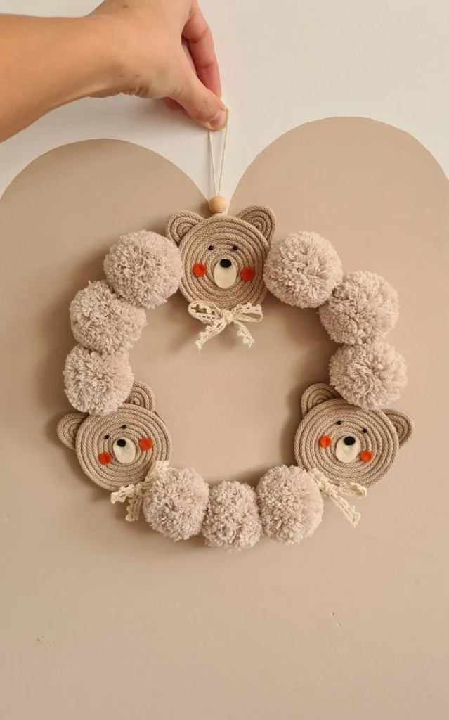 A cute wall wreath made of pom-poms and teddy bear faces brings a crafty look to the nursery. The soft textures and playful design add warmth to a plain wall. It works well above a crib, dresser, or even as a door decoration. Handmade pieces like this make the theme feel extra special.