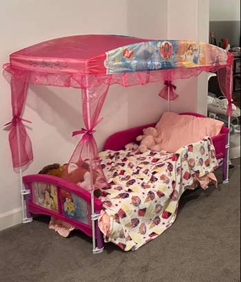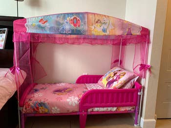 Turn bedtime into a magical adventure with this Delta Disney Princess bed. The soft, sheer organza canopy makes your little one feel like a princess in her very own castle.
