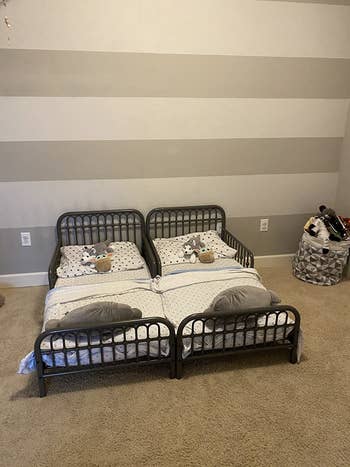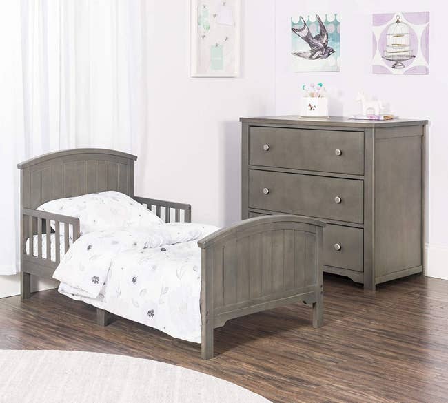 This modern toddler bed offers a mix of safety and style with its soft cushioned sides and neutral gray and white colors that blend with any room decor.