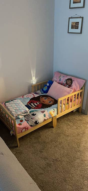 It’s the perfect size and height for toddlers, with two built-in guardrails to keep her safe and snug all night.