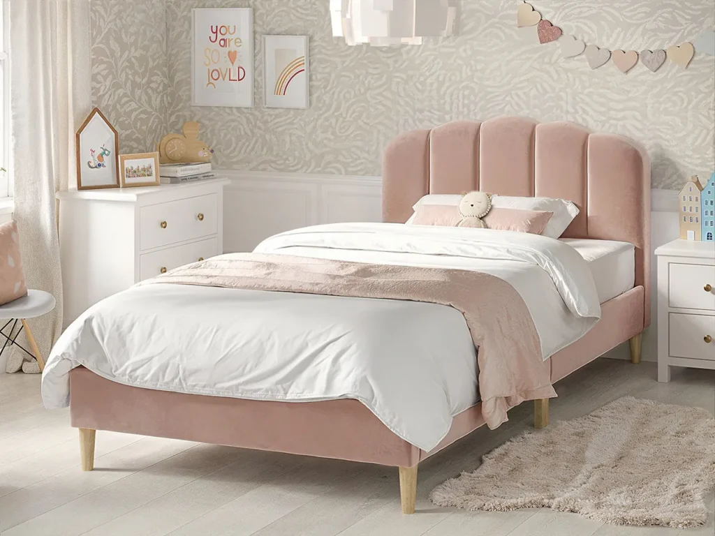 Soft, elegant, and oh-so-cozy, this blush pink velvet bed is perfect for your little one’s next big upgrade. The scalloped headboard gives it a gentle, whimsical look while the plush upholstery makes it feel extra special.