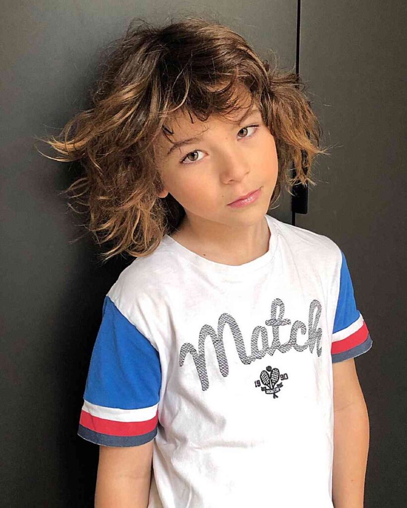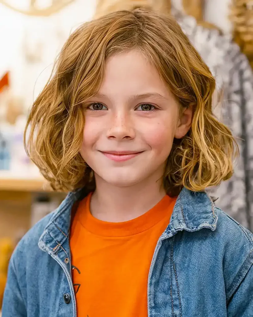 Soft layers and loose waves create a carefree, playful finish in this medium-long haircut. It’s an ideal choice for boys with natural waves who like a little movement without looking overly styled.