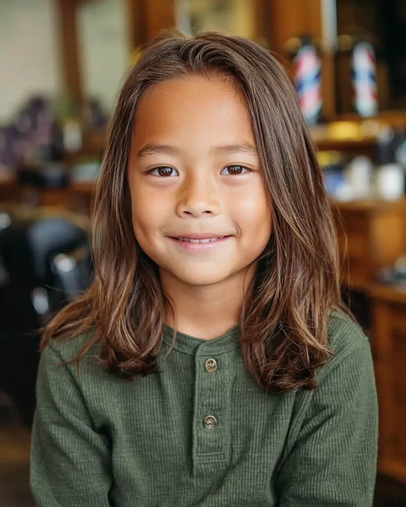 This easygoing cut keeps medium-long strands flowing naturally around the shoulders with a straight yet slightly textured finish. It’s perfect for boys with smooth, medium-density hair who like a simple, low-effort style.
