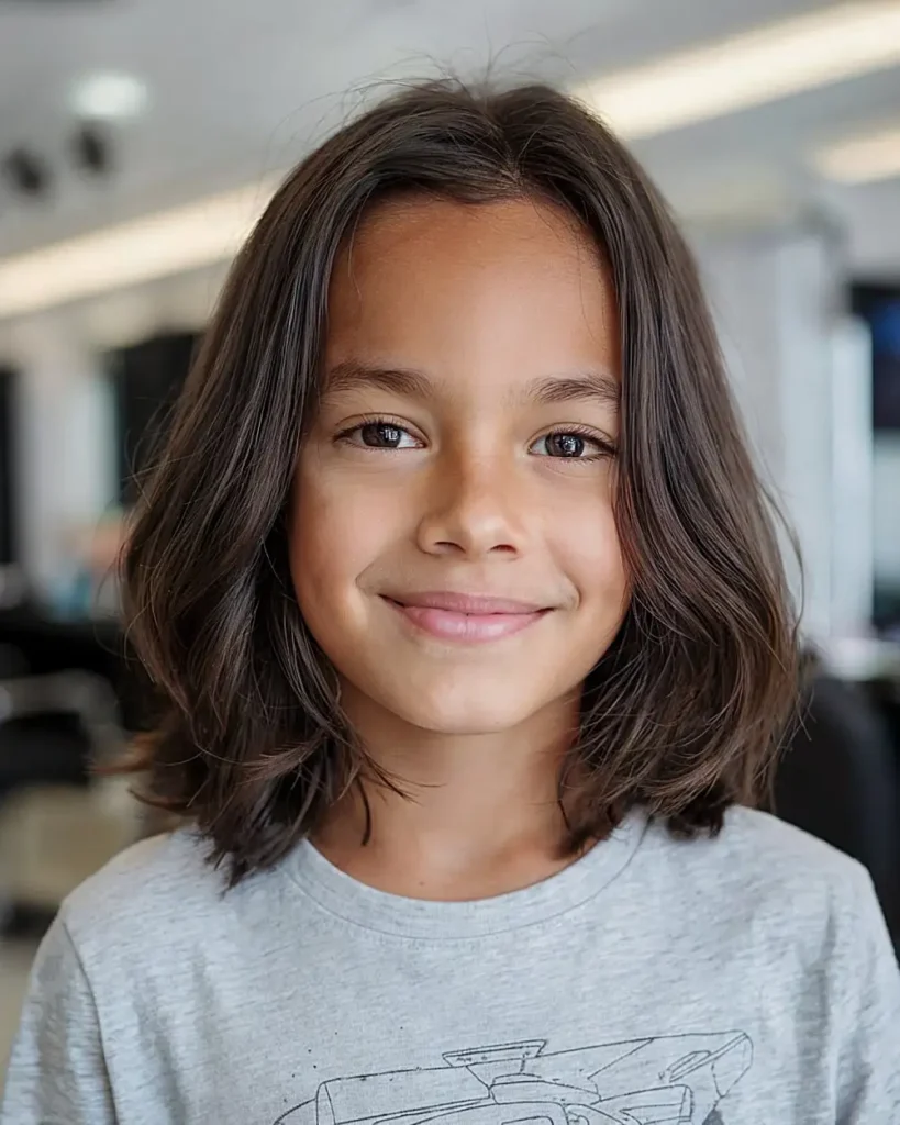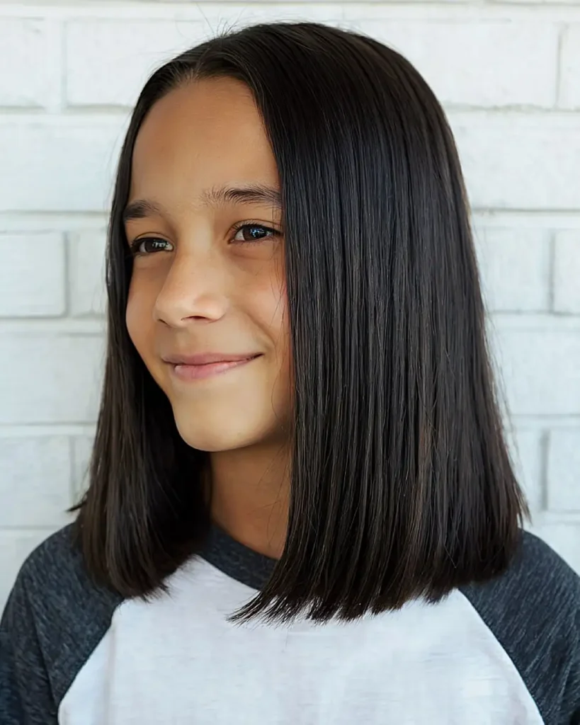 Clean and polished, this shoulder-length style with blunt ends gives a tidy and modern look. It’s best for boys with straight, fine-to-medium hair who prefer something sleek and easy.