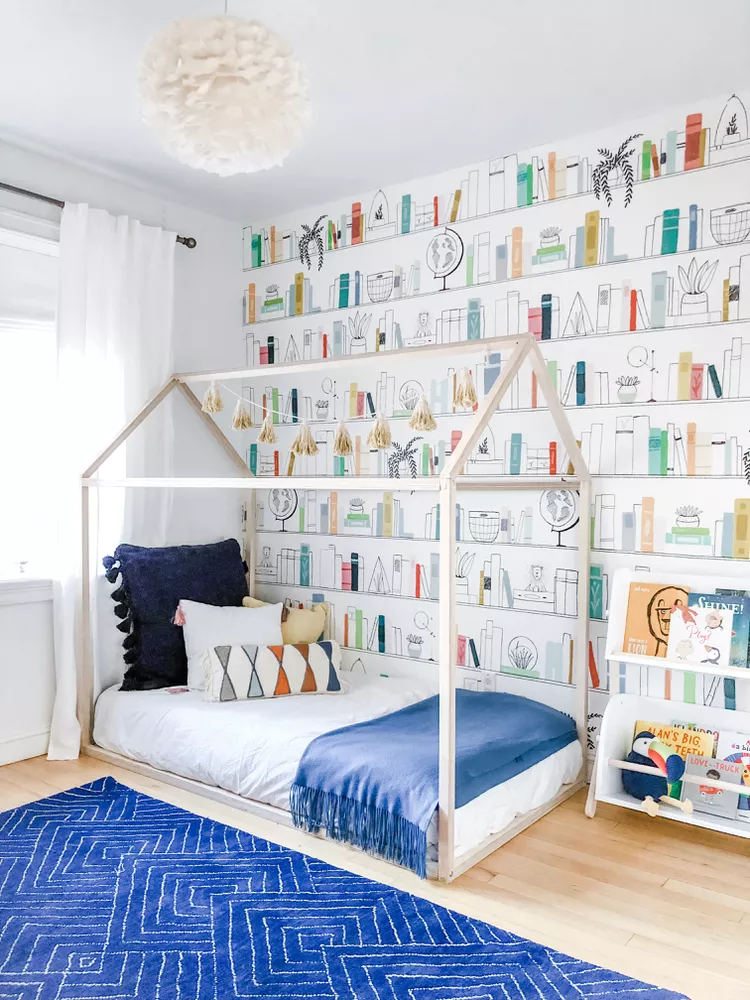 Create a cozy corner that celebrates reading by using illustrated bookshelf wallpaper. A house-shaped bed frame adds a touch of playfulness and warmth, making the space feel personal and imaginative.